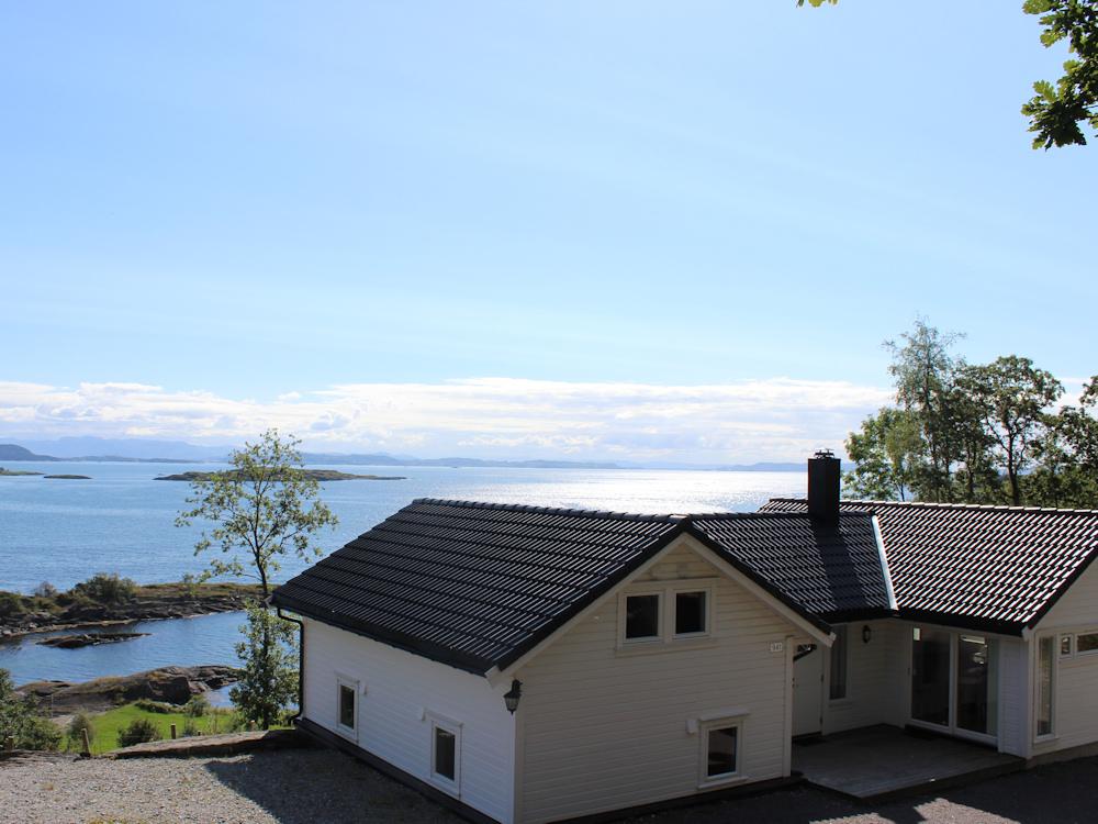 In a quiet location just 45 minutes drive south of the coastal town of Haugesund lies this vacation house in a bay with panoramic view to the Boknafjorden and the open sea .